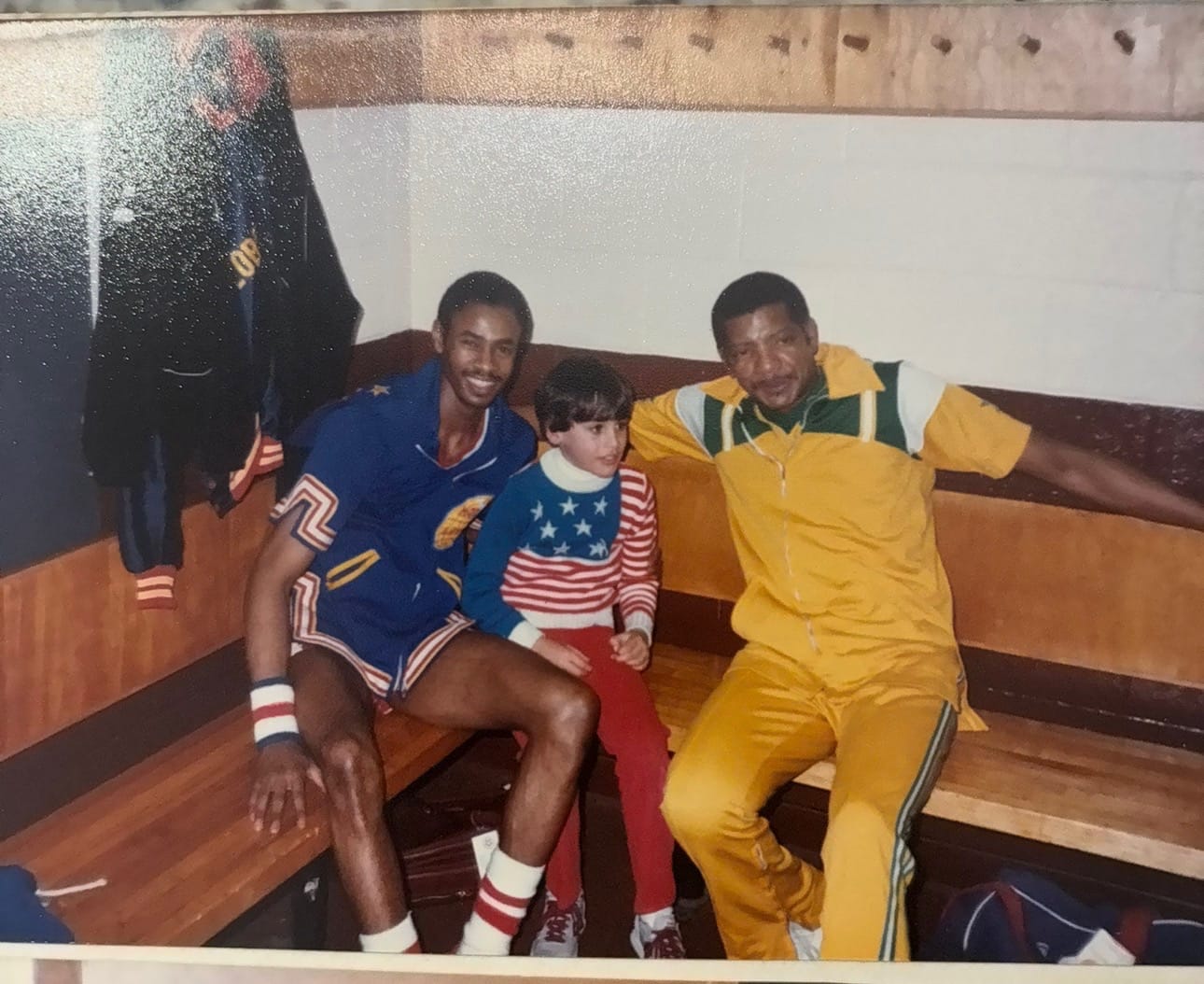 A young Chris Ford sits with Curley Neal (Left) and with a member of the Globetrotters and the Washington Generals.