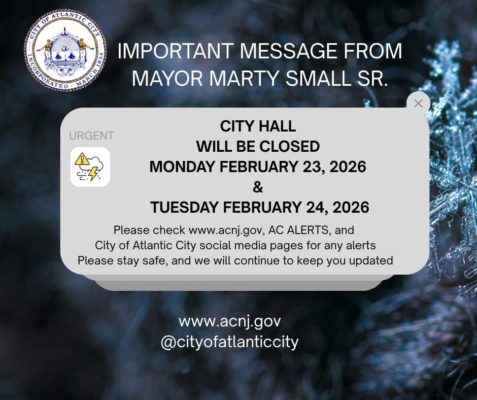City officials announced that City Hall and other Atlantic City municipal buildings would be closed to non-essential employees Monday, Feb. 23,2026 with additional closure information to be shared through AC Alerts and city communication channels. A city notice also stated City Hall would remain closed Tuesday, Feb. 24,2026.