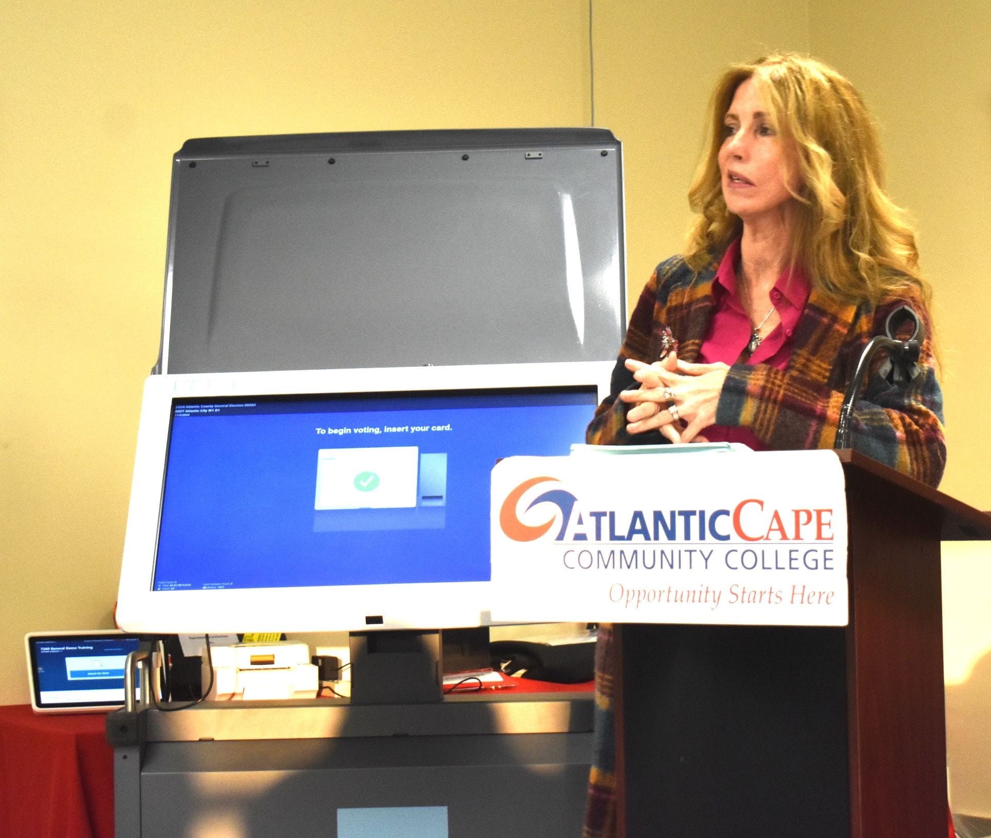 Atlantic County Superintendent of Elections Maureen Bugdon demonstrated how to use the new voting machines and discussed important dates.
