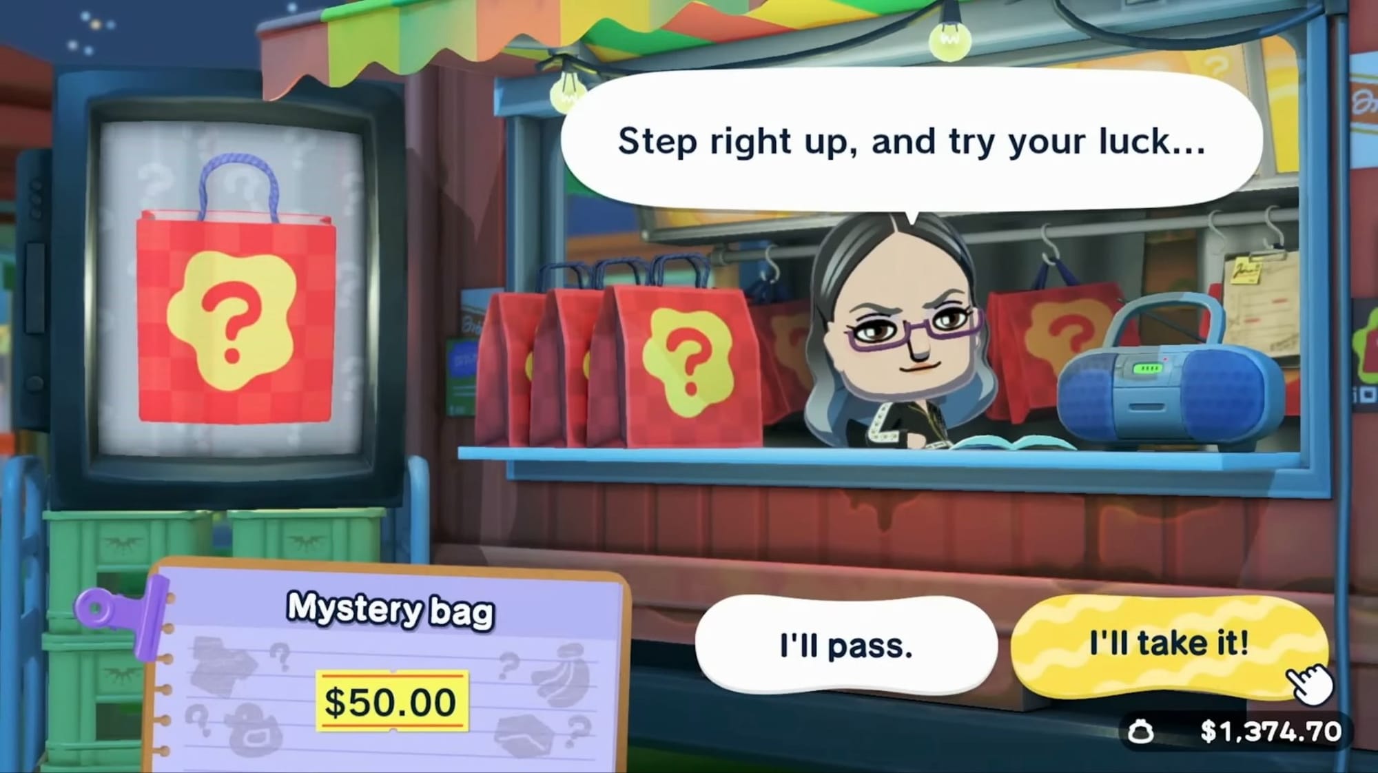There’s also other stores to shop from on your island. For instance, Fresh Kingdom allows players to experience inflation in real time! You can pay $60 at Fresh Kingdom for a crab or wait for some other deals to spring up. You can also go down to the Marketplace and get some mystery bags that hold interesting stuff. Can’t go to the store looking crusty though. Make sure your Mii’s outfits are right and tight at Where & Wear! Model a cute dress, an egg outfit, and even a hotdog suit. Personally, my Mii’s outfit of the day is the hotdog costume.