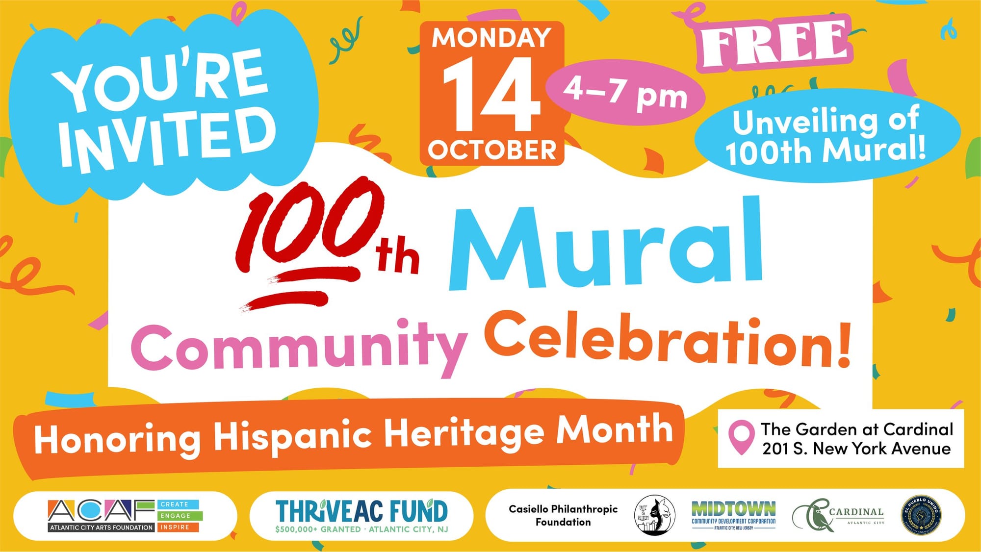 Atlantic City Art Foundation’s 100th Mural is made possible through the generous support of Presenting Sponsor ThriveAC Fund, with additional support from New Jersey Casino Reinvestment Development Authority, Midtown Community Development Corporation, the Casiello Philanthropic Foundation, and Kitten & Puff. The 100th Mural event celebration is held in partnership with Cardinal and promotional support from El Pueblo Unido Atlantic City.