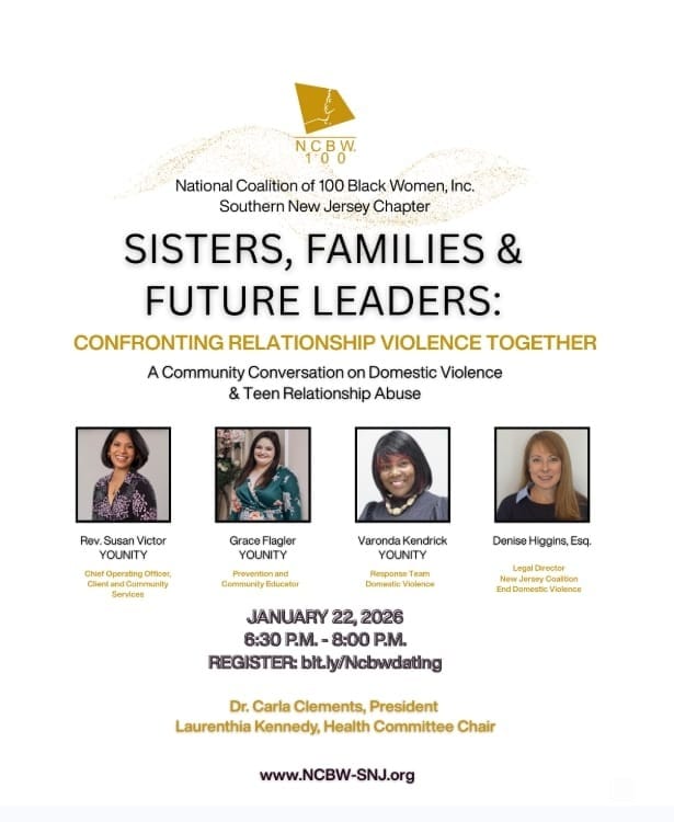 The National Coalition of 100 Black Women, Inc., Southern New Jersey Chapter, invites you to an essential community dialogue focused on understanding, preventing, and addressing relationship violence across generations.